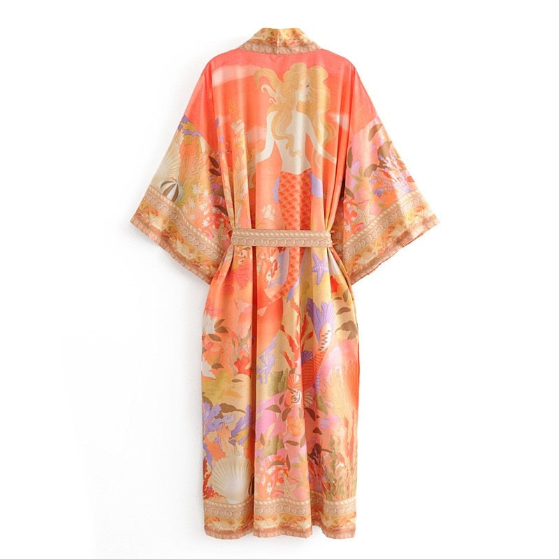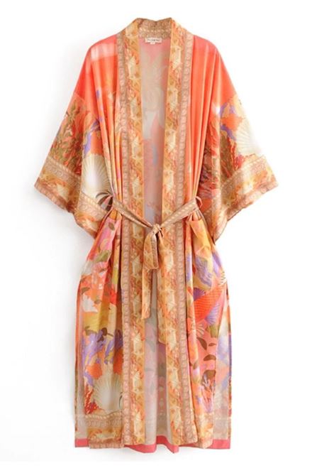 Beautiful Bohemian Style Orange Flower Crane Print Kimono