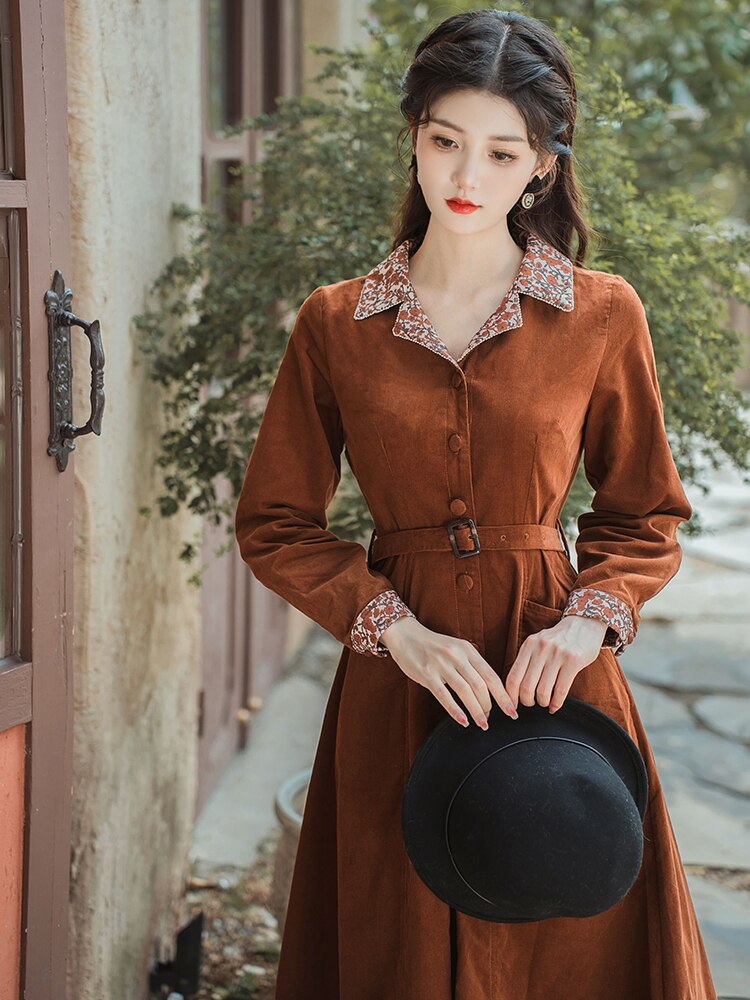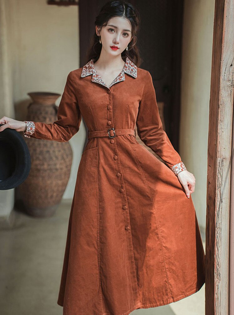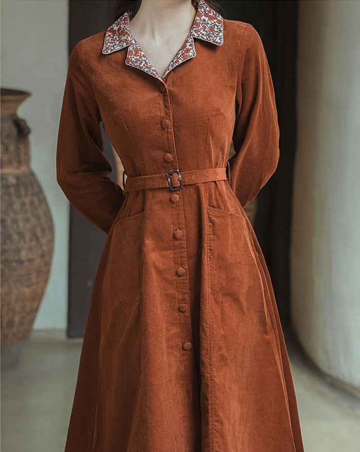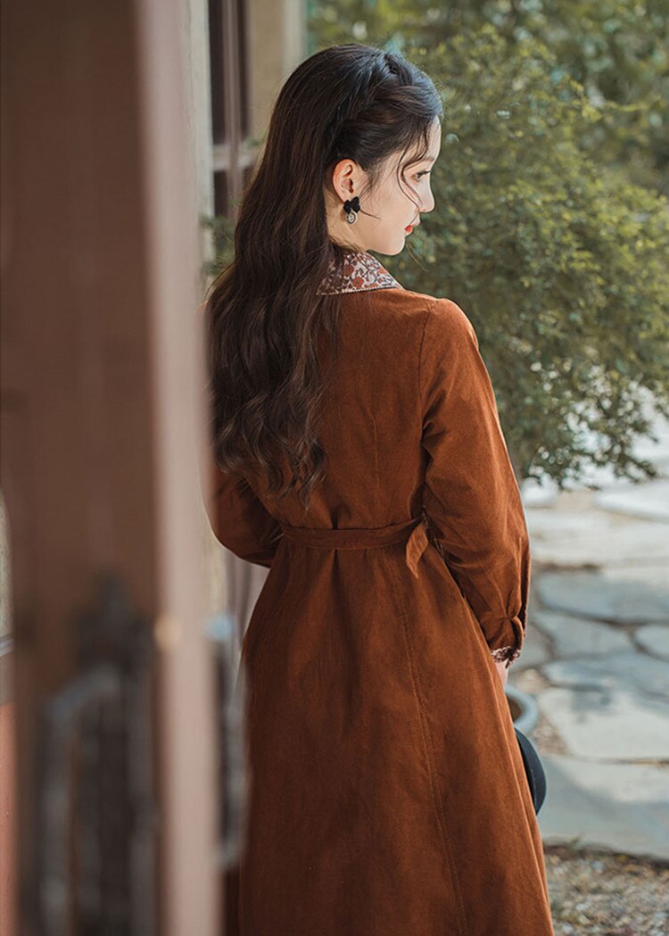 Della - Retro Turn Down Collar Overcoat Dress With Belt
