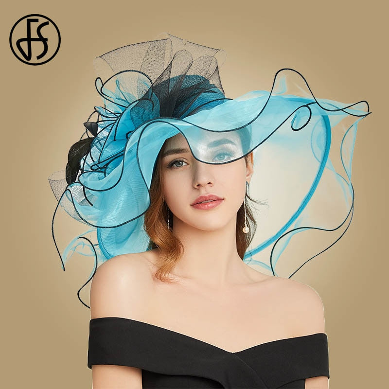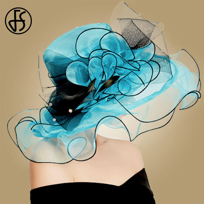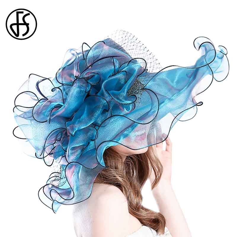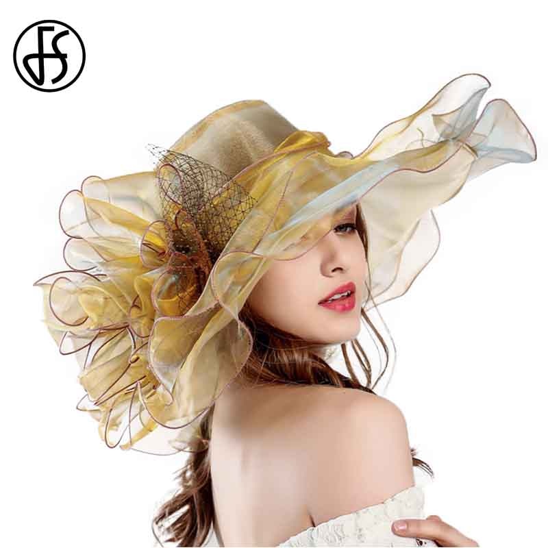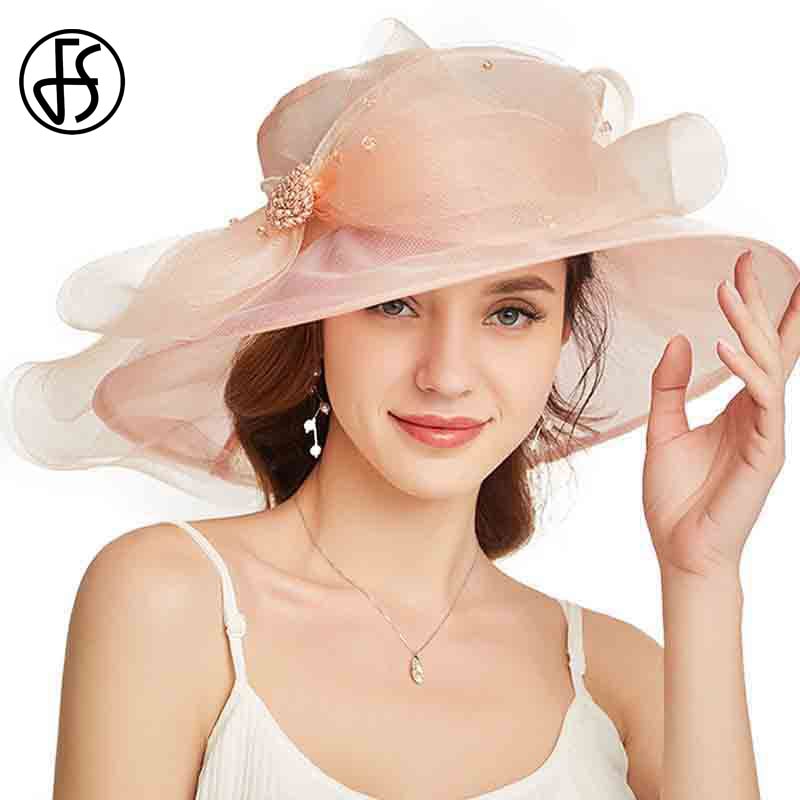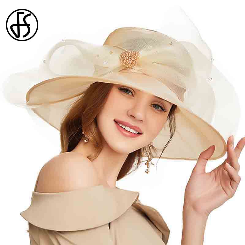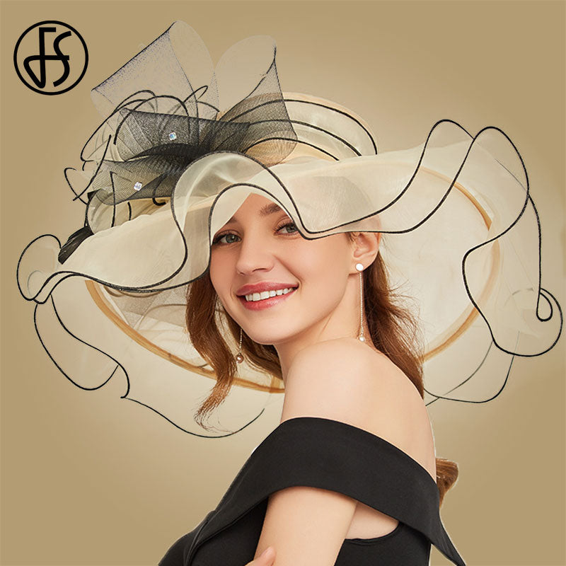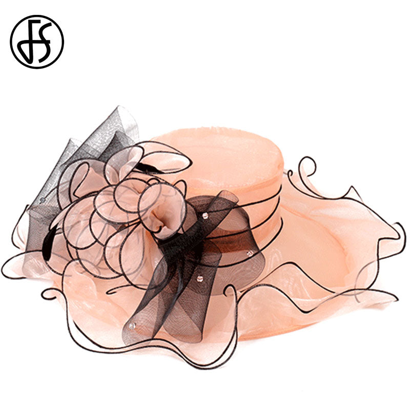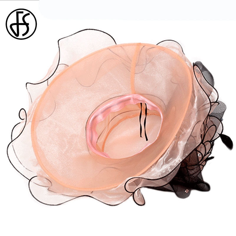 FS Big Flower Sun Hats For Women Beach Beige Organza Tea Party Hat Elegant Ladies Church Kentucky Derby Wide Brim Fedoras